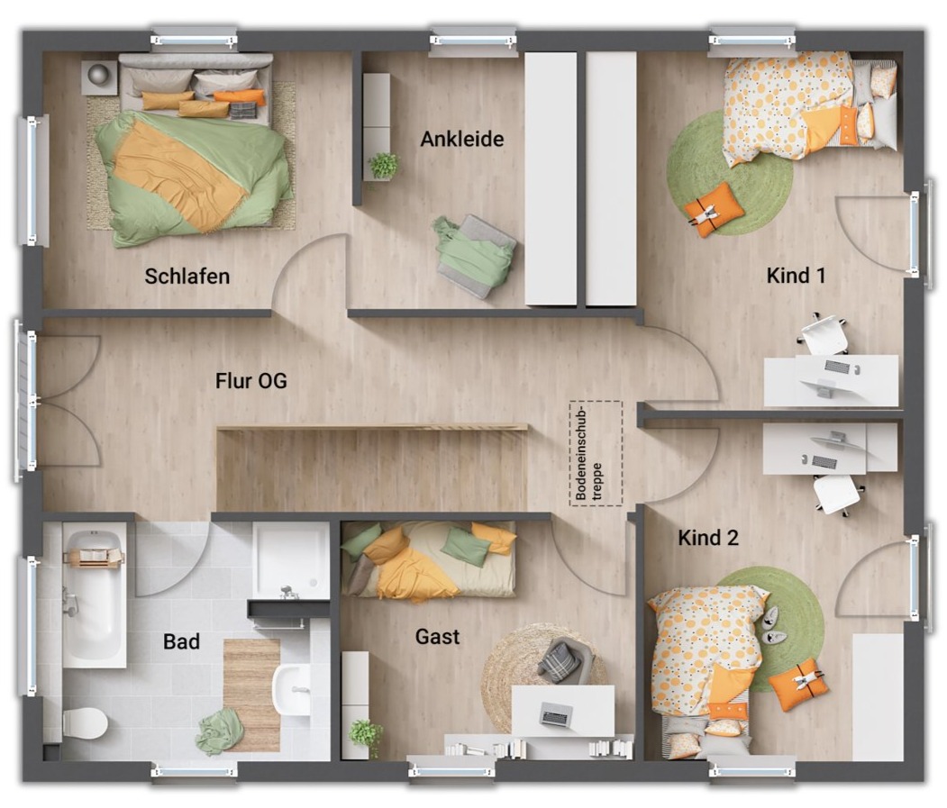 Auch das Obergeschoss zeigt sich im gradlinigen Baustil des Hauses. Hier finden Sie drei Zimmer, die Sie nach Ihren Vorstellungen als Schlaf-, Kinder- oder Gästezimmer nutzen können. Große Fenster lassen auch hier viel Tageslicht hineinströmen. Die Ankleide im Schlafzimmer bietet viel Stauraum.